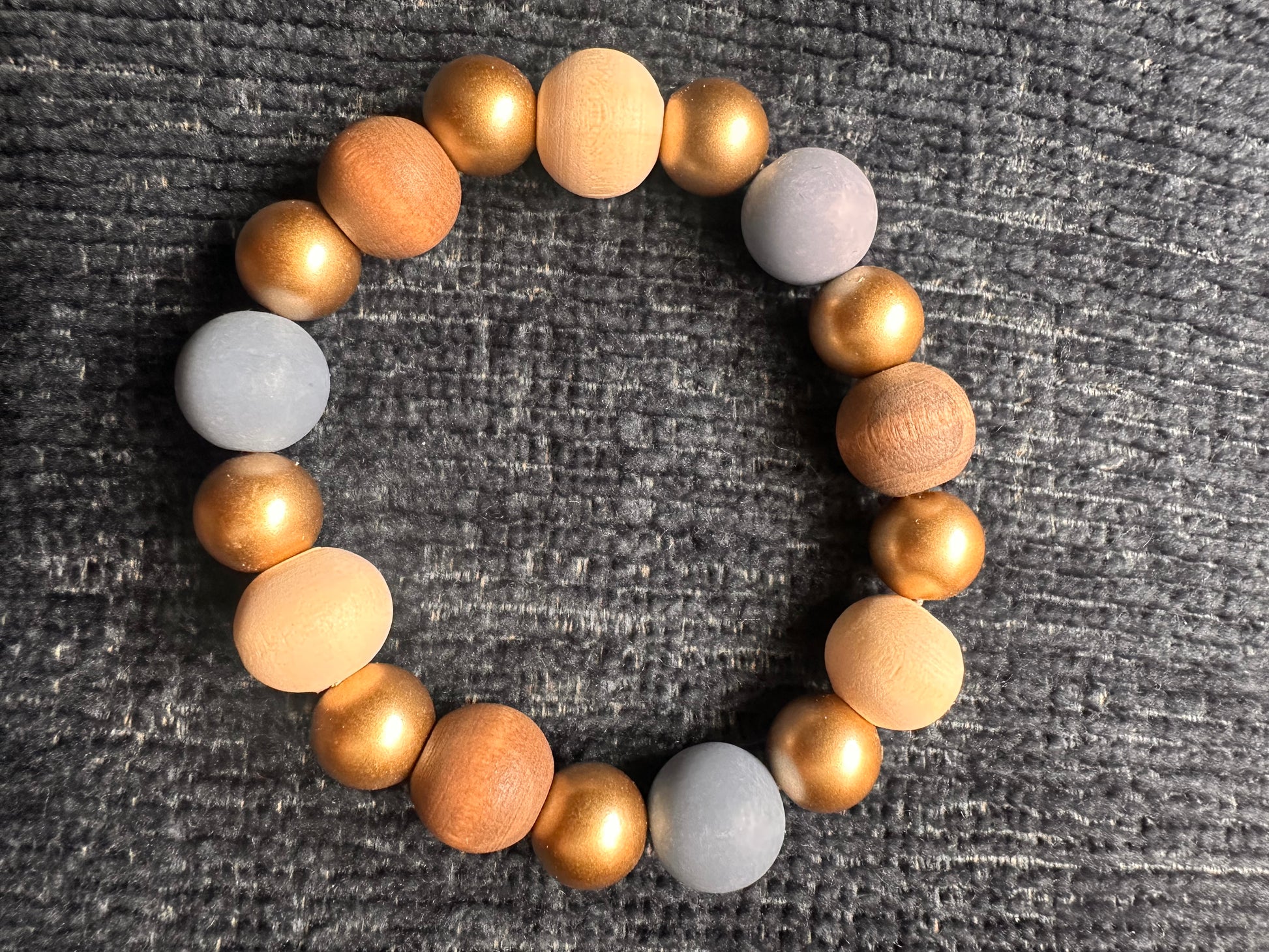 Cream, Blue, Brown and Gold Colored Hand Strung Beaded Stretch Bracelet